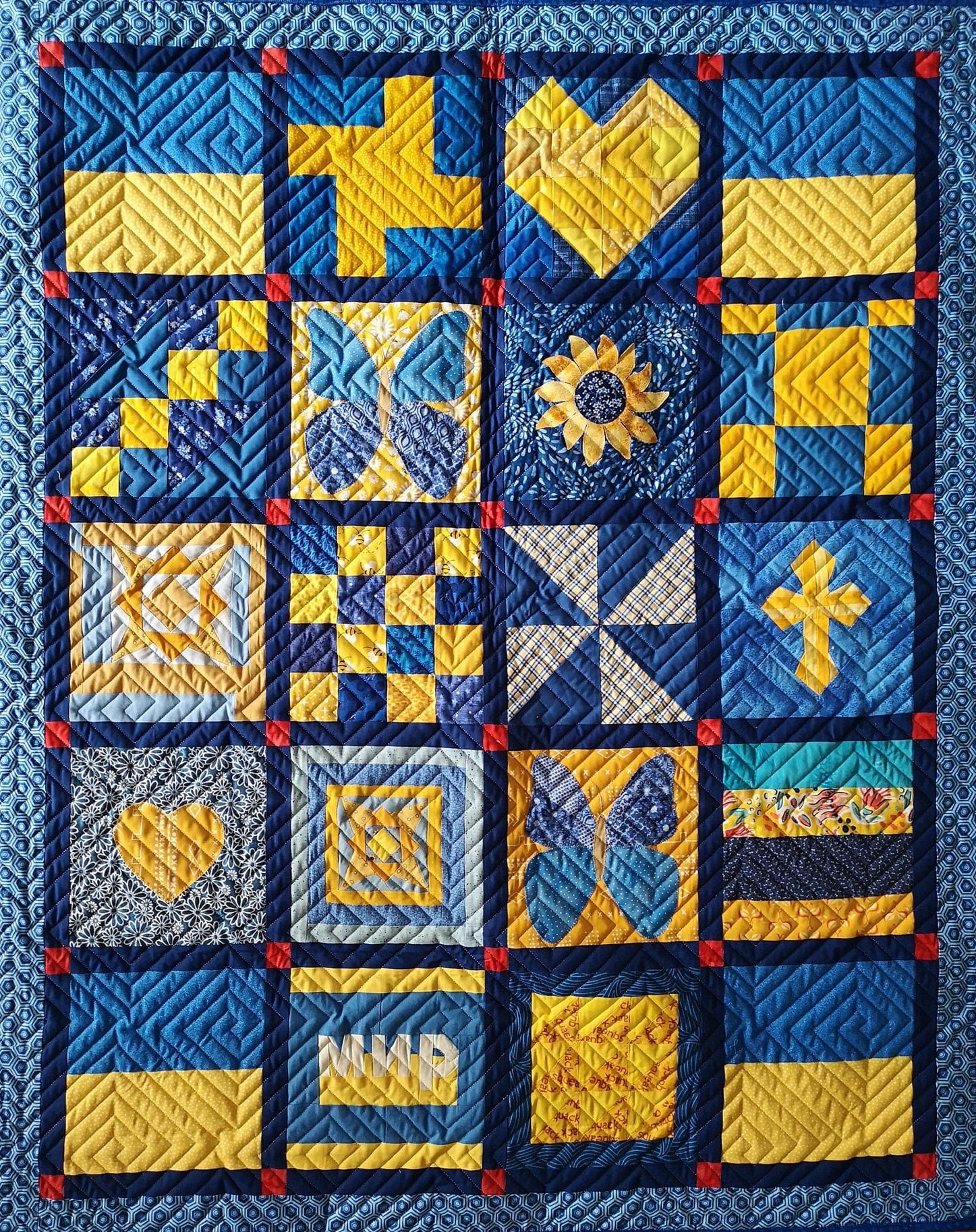 Aus 27 Ländern erhielten wir nach unserem Aufruf im Februar 2022 über 28.850 Patchwork-Blöcke mit unterschiedlichen Motiven in den Farben der Ukrainischen Flagge.